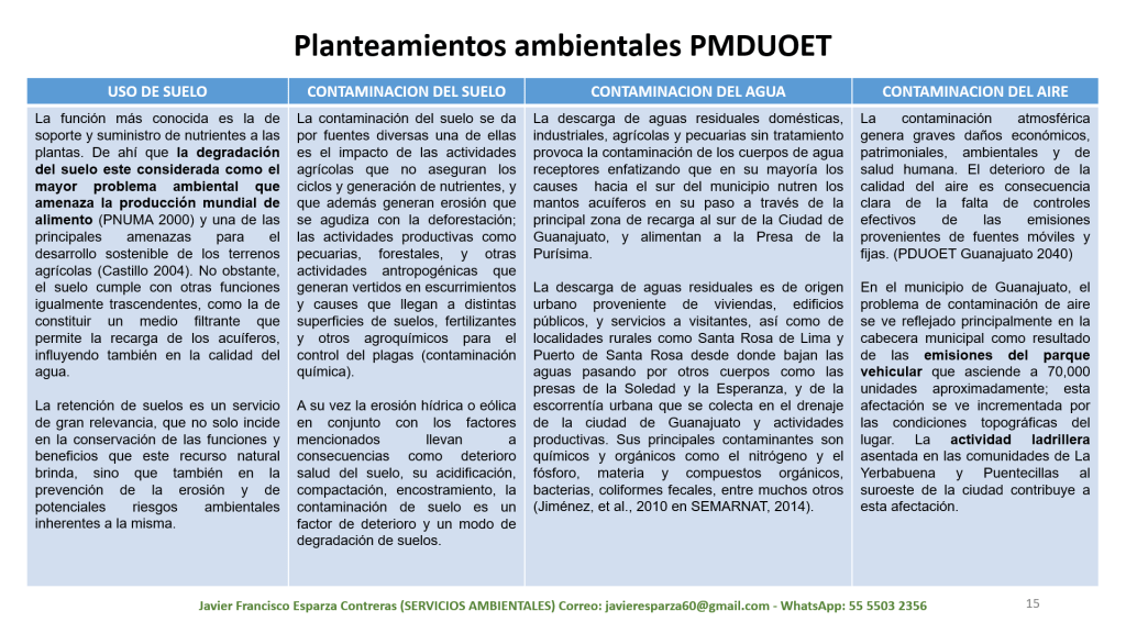 A continuación se señalaran los RUBLOS AMBIENTALES que requieren REVISIÓN Y EVALUACIÓN por parte del MUNICIPIO DE GUANAJUATO, para la determinación de la situación ambiental y de calidad que tiene esta ciudad.